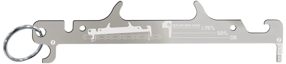 Accrochez-le près de votre stand de réparation avec l’anneau inclus pour ne plus jamais passer trop longtemps sans vérifier l’usure de votre chaîne. N’oubliez pas de le remettre en place après avoir bu une bière fraîche avec le décapsuleur intégré.
